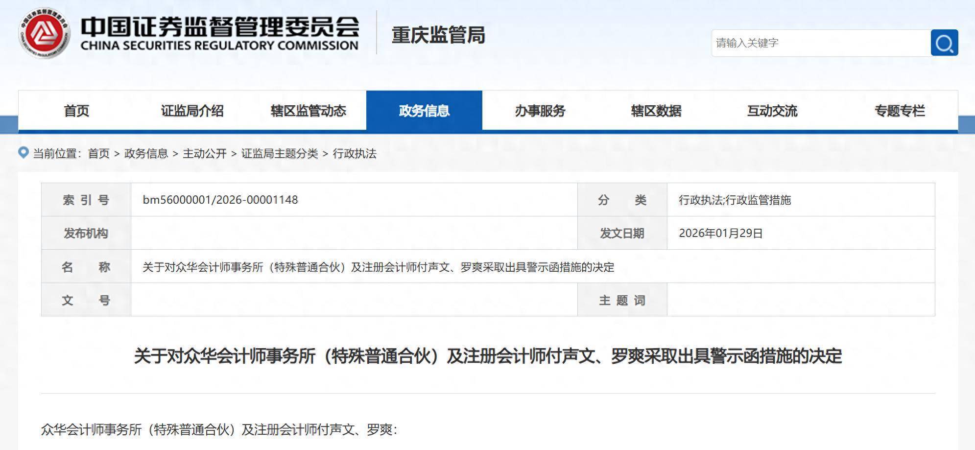 上述活动违背了《上市公司信息表现处治办法》(证监会令第182号,以下简称《信披办法》)第四十五条、第四十六条的关联规则。根据《信披办法》第五十五条的规则,重庆证监局决定对众华所及署名司帐师付声文、罗爽采纳出具警示函的行政监管要领,并记入证券期货商场诚信档案。你们应严格遵照《中国注册司帐师审计准则》关联规则,进一步强化质料为止与复核,切实晋升握业质料。